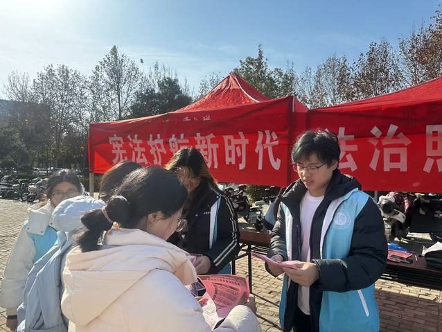 12月4日中午,“政”在说法普法团队志愿者在科学校区清苑餐厅门口举办了“宪法护航新时代 法治照亮幸福路”为主题的普法宣传活动。活动现场,志愿者热情地为来往的同学讲解法律知识,并发放宣传页,其中包含国家安全教育法律法规,公民如何维护自身权益,如何预防新型诈骗等相关知识,并且为同学们解答了生活中与法律相关的一些问题,宣传了全民守法的理念。