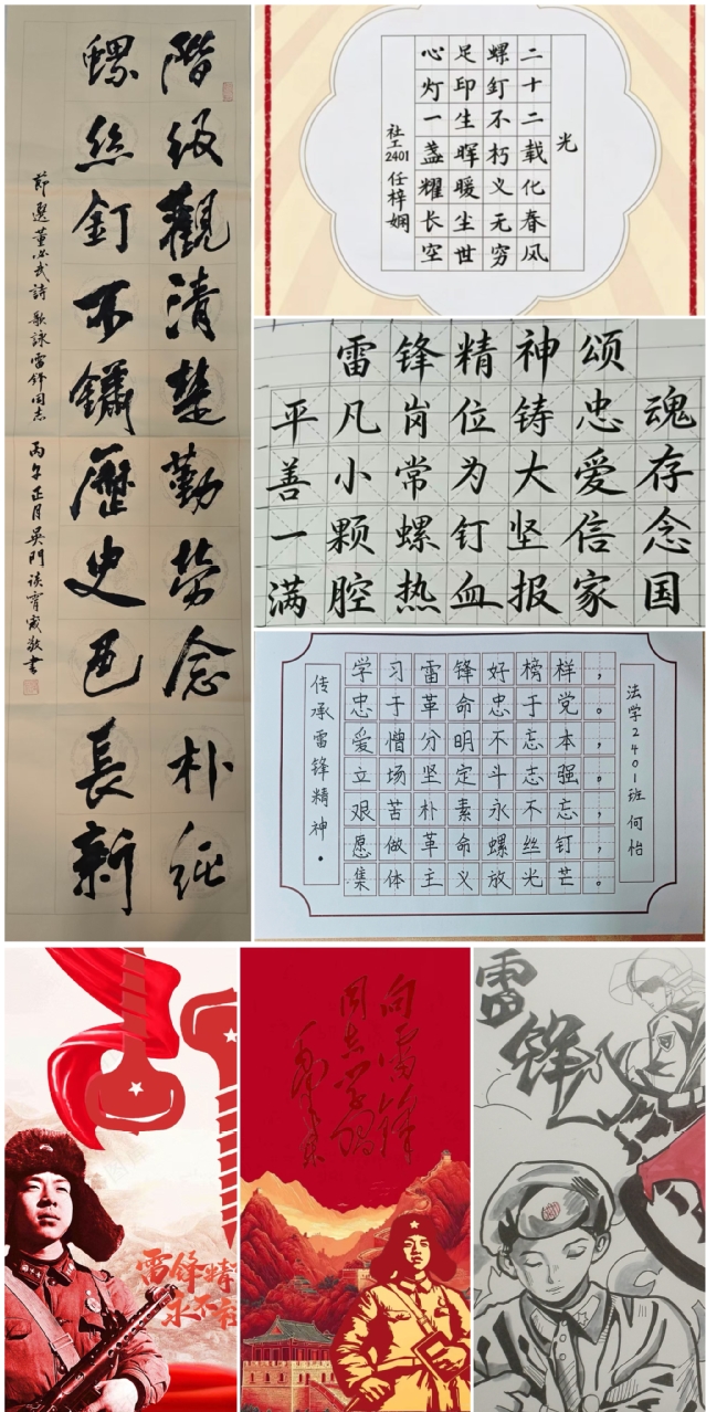 活动自启动以来,得到了全院同学的积极响应与热情参与,共收集到各类参赛作品百余份,作品主题鲜明、形式多样、情感真挚,尽显新时代青年对雷锋精神的理解与践行。同学们紧扣“雷锋精神永传承”核心主题,用丰富的创作视角诠释雷锋精神的当代价值。书法作品笔墨铿锵,书写“向雷锋同志学习”“雷锋精神代代传”等经典话语,字里行间饱含敬意;绘画与海报作品色彩鲜明,或以雷锋经典事迹为蓝本,或描绘校园里的学雷锋暖心瞬间,将无私奉献、助人为乐的精神具象化。每份作品都凝聚着同学们对雷锋精神的认同与传承,展现了新时代青年向上向善的精神风貌。同学们纷纷表示,此次创作的过程也是重温雷锋事迹、感悟雷锋精神的过程,不仅提升了自身的创作能力,更坚定了从身边小事做起、践行雷锋精神的决心。
